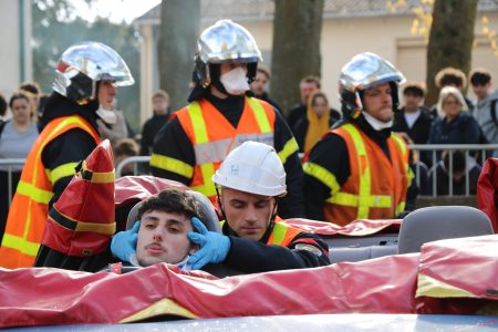 Une voiture retournée sur le parking. Des pompiers en combinaison. Le bruit sourd des outils hydrauliques qui mordent dans la carlingue froissée. Ce matin au Campus la Châtaigneraie, la sécurité routière n’était pas un cours magistral.
